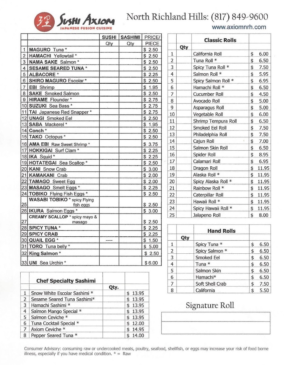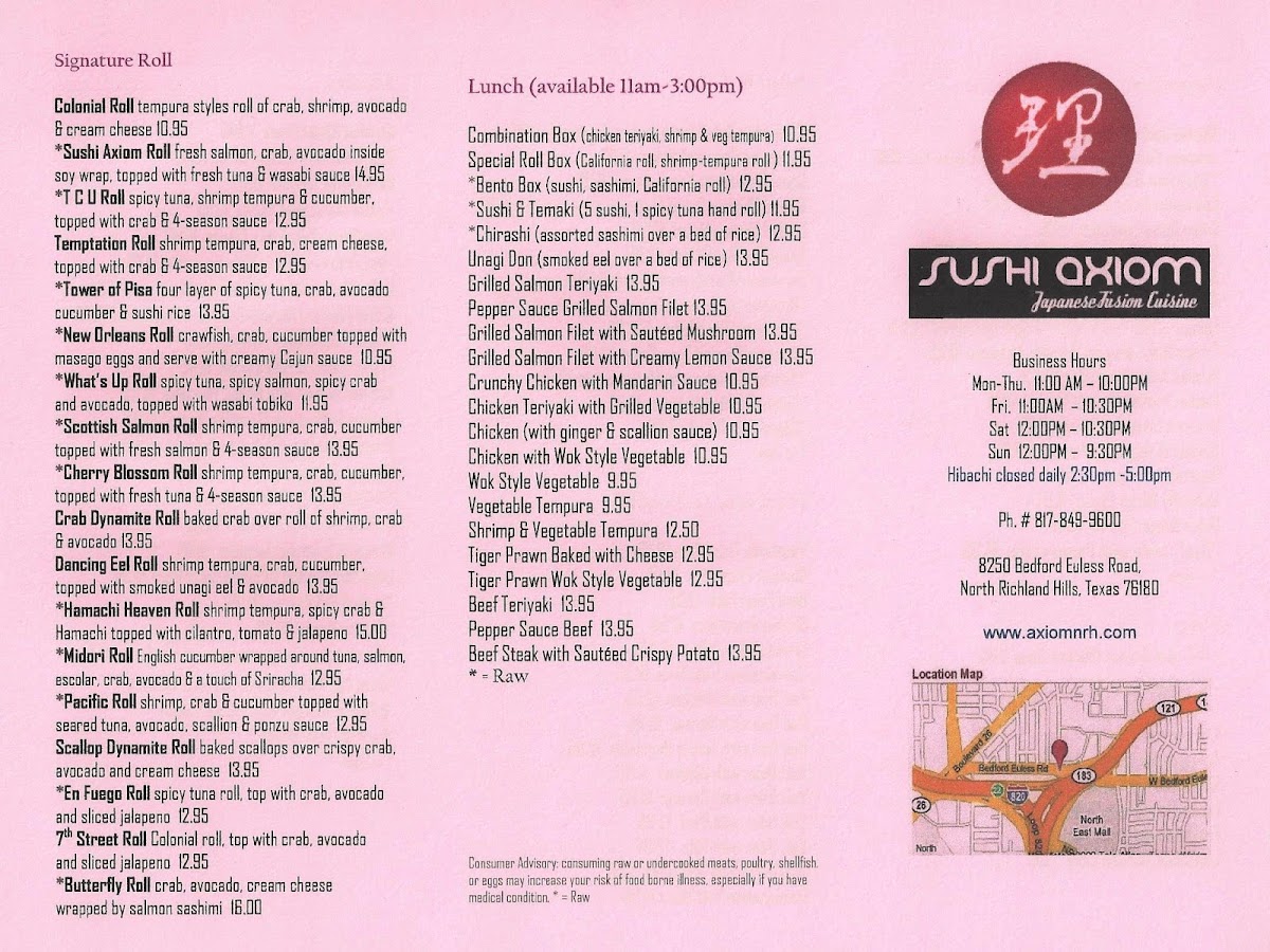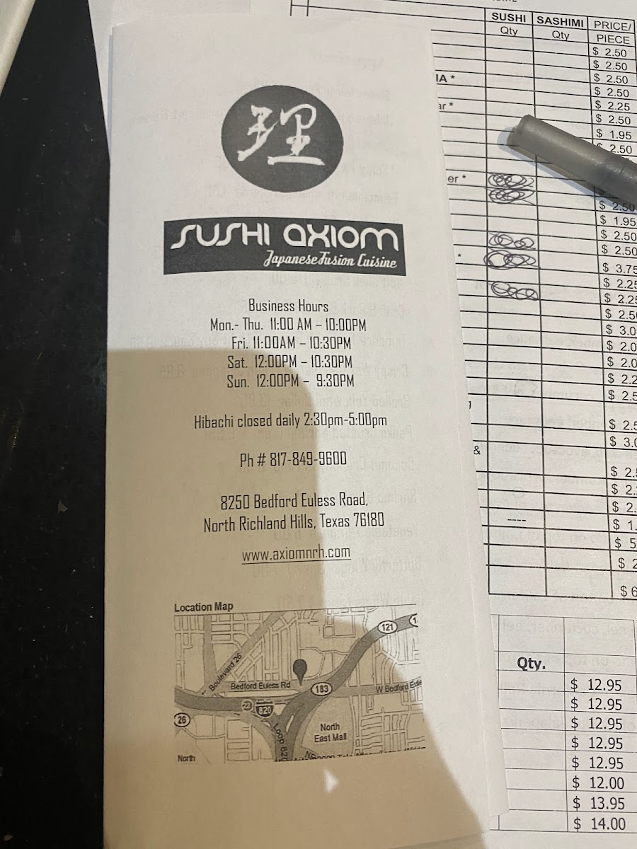 Welcome to Sushi Axiom - North Richland Hills, where culinary artistry meets a lively hibachi experience. Located at 8250 Bedford Euless Rd, this vibrant eatery combines delectable flavors and engaging entertainment, making it an ideal choice for families and food lovers alike. Guests rave about the succulent filet mignon, praised for its buttery tenderness, and the show-stopping hibachi performances that captivate both young and old.